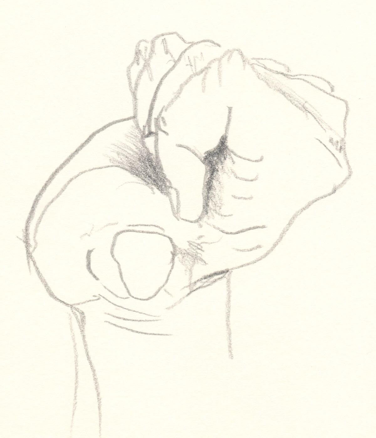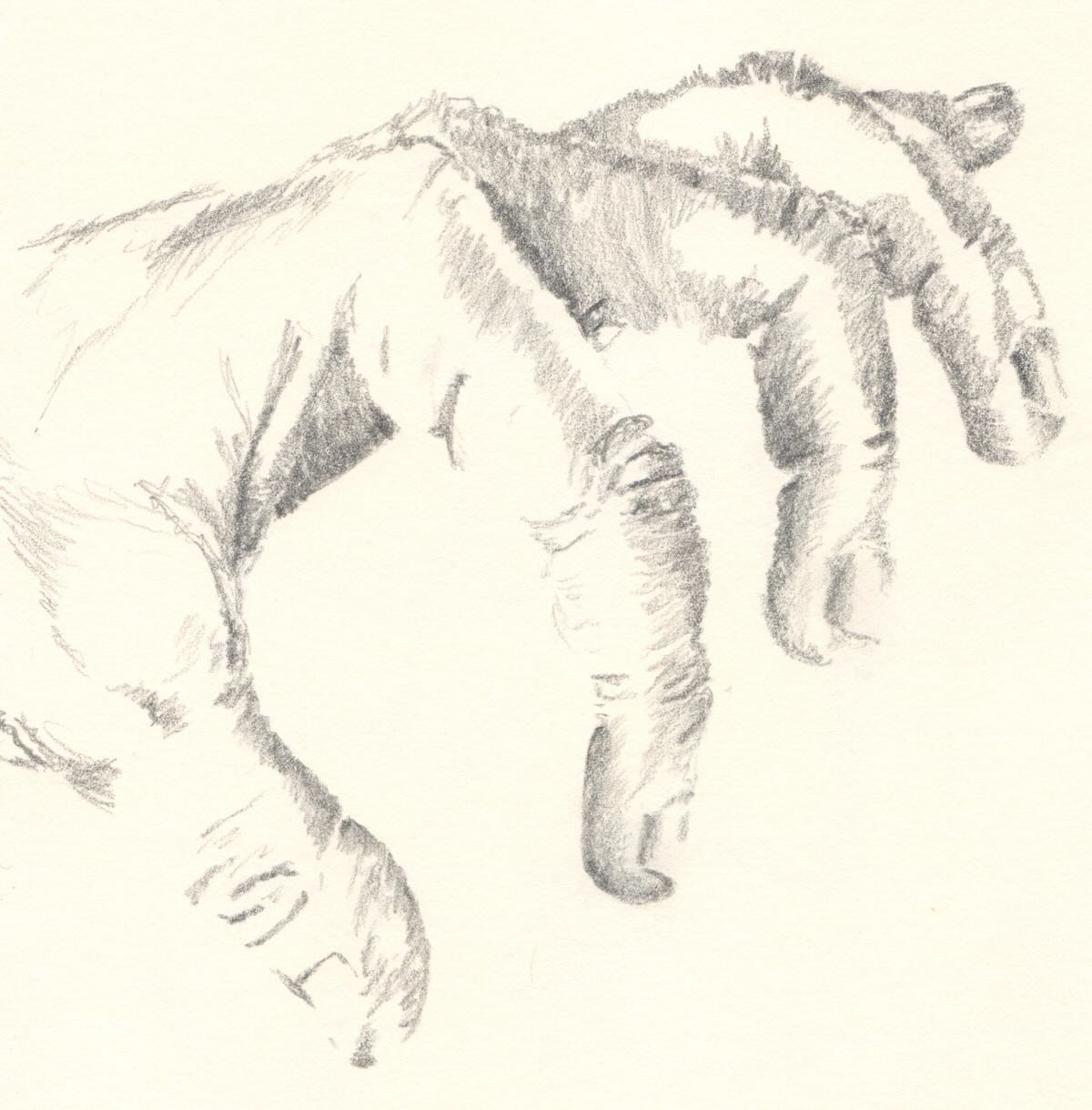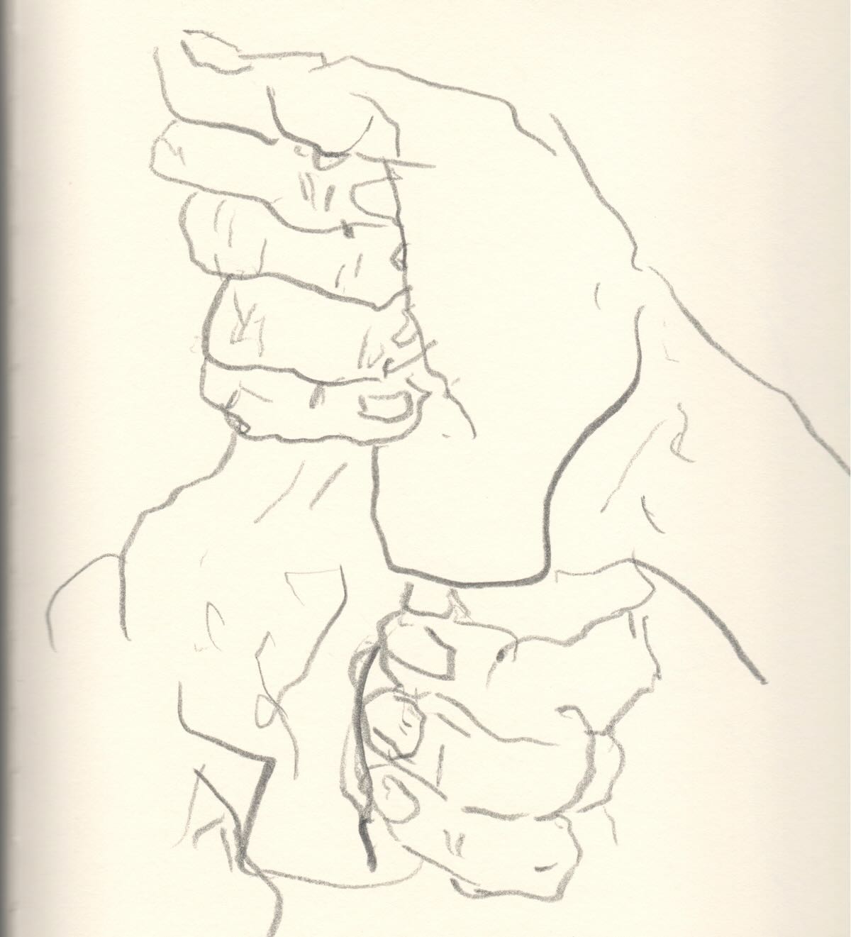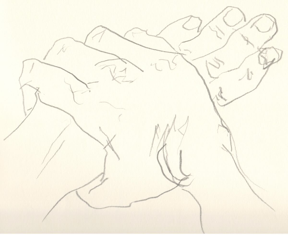 Meine Professorin sagte immer: Wer Hände zeichnen kann, kann alles zeichnen. Ich zeichnete zunächst mit rechts. Dann mit links. Aber wenn man beide Hände gleichzeitig zeichnen will, dann muss man sich etwas einfallen lassen: Mit dem Fuß geht es auch.